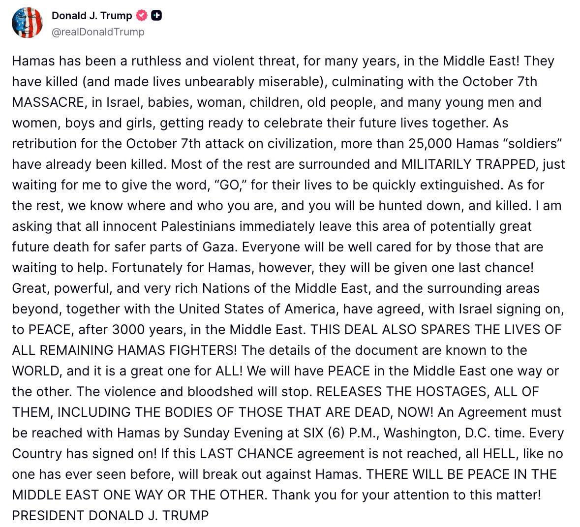 Соглашение с ХАМАС должно быть достигнуто к вечеру воскресенья, к 6 часам вечера по времени Вашингтона. Если это последнее соглашение-шанс не будет достигнуто, против ХАМАС разразится Ад, подобного которому мир ещё не видел. МИР НА БЛИЖНЕМ ВОСТОКЕ БУДЕТ — ТАК ИЛИ ИНАЧЕ’.