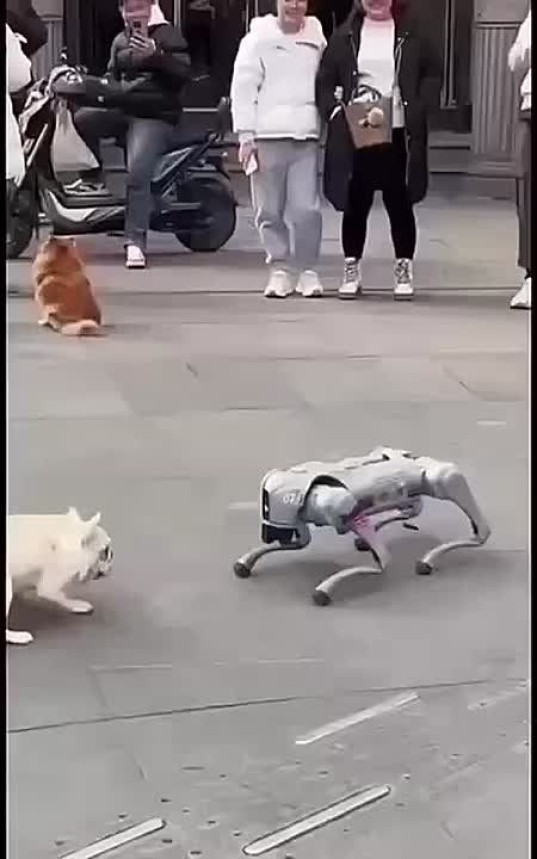 Поразительно, собакоробот точно копирует поведение играющей с ним живой собаки. Французик смешной.