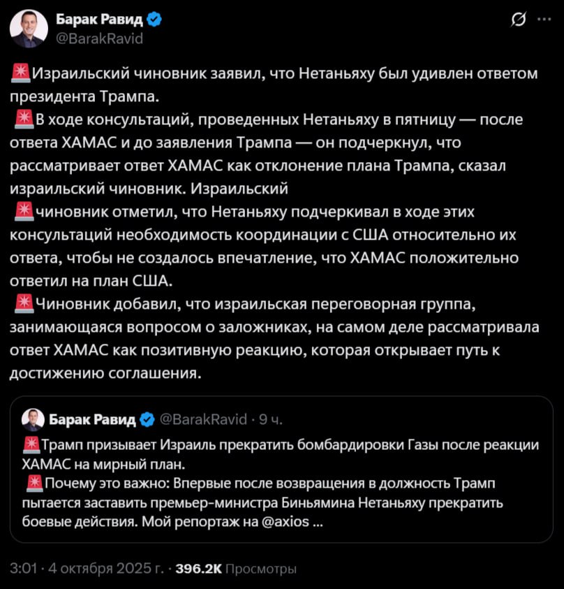 Премьер-министр Израиля Биньямин Нетаньяху был удивлён последующим заявлением президента США Дональда Трампа о готовности ХАМАС к миру.