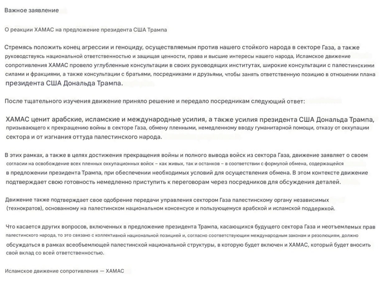 В заявлении не упоминалось о последнем заявлении Трампа или его требовании немедленно прекратить израильские удары в секторе Газа, хотя израильские СМИ сообщили, что после заявления президента США политическое руководство приказало ЦАХАЛ прекратить атаку на города сектора Газа.