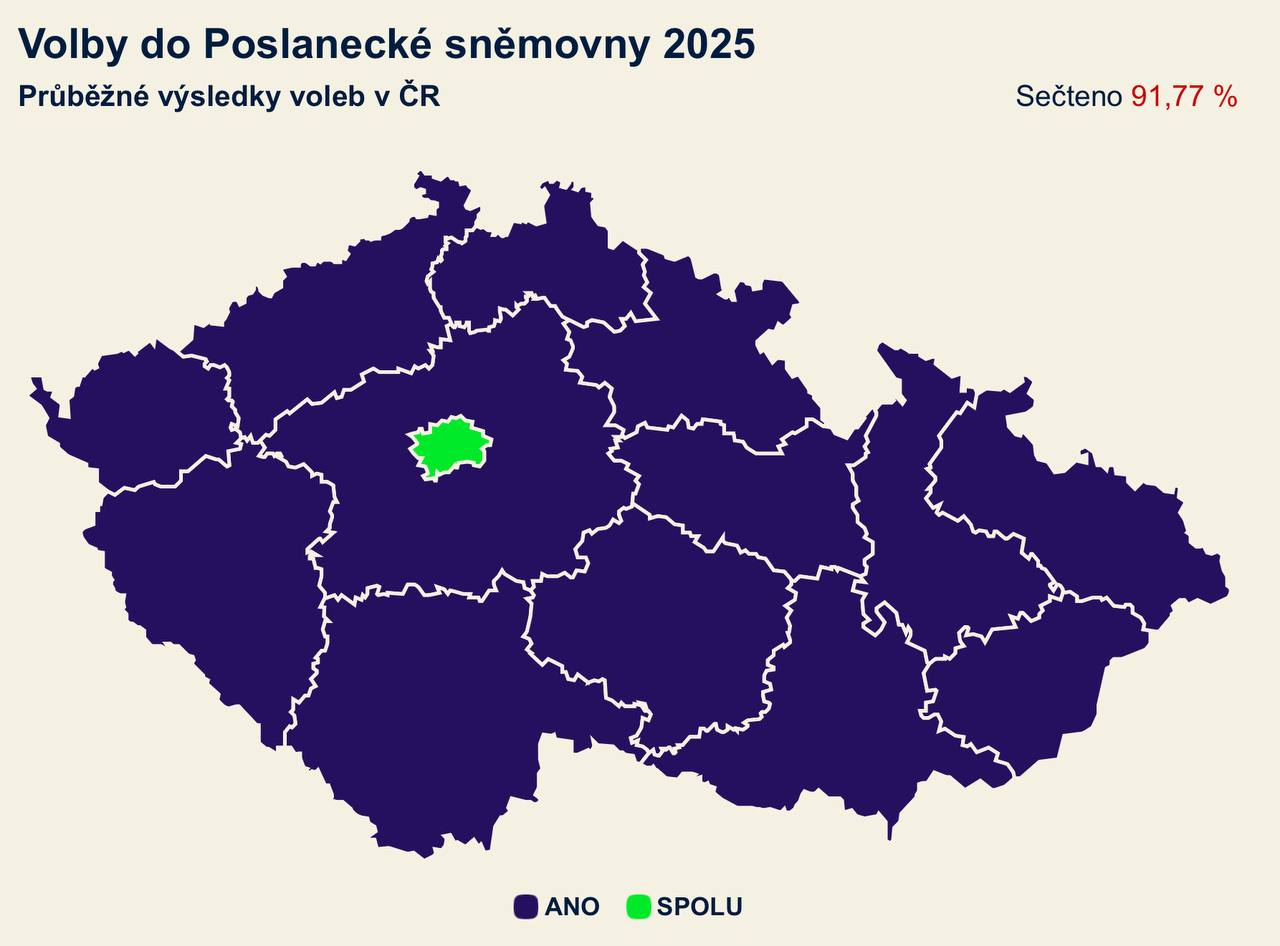 В Чехии близок к завершению подсчет голосов на парламентских выборах-2025, подсчитано уже более 75% бюллетеней. Как и прогнозировалось, довольно уверенно лидирует оппозиционный блок Андрея Бабиша, которого западная пресса окрестила «чешским Трампом». Обратите внимание на карту: блок Бабиша ANO выигрывает все округа в стране. Исключением традиционно стала более либеральная Прага, где на первом месте идет правящая коалиция Spolu («Вместе»).