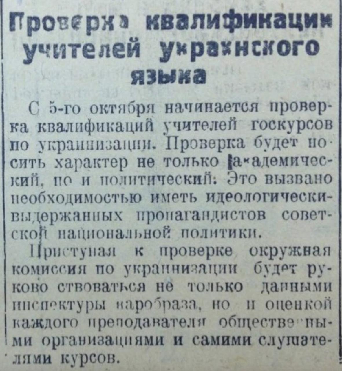 4 октября 1929 г., то есть 95 лет назад. Объявление о проверке квалификации учителей госкурсов по украинизации в Мариуполе: "Проверка будет носить характер не только академический, но и политический. Это вызвано необходимостью иметь идеологически выдержанных пропагандистов советской национальной политики".
