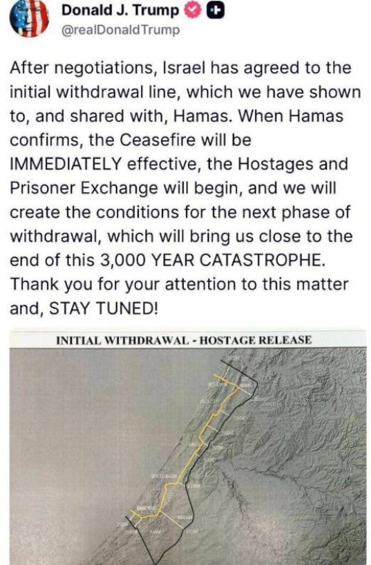 Трамп заявил, что Израиль должен в ближайшее время отвести войска на обозначенную США линию. После чего начнутся переговоры об обмене заложниками.