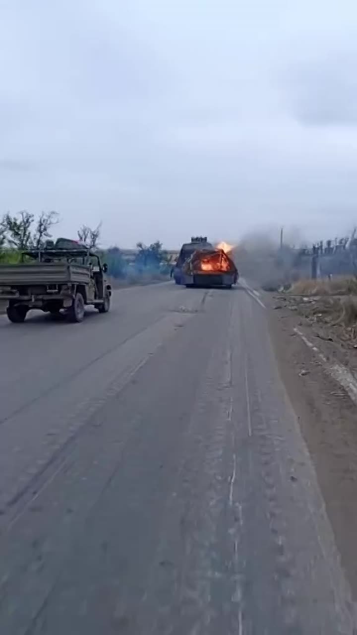 Поврежденную технику с подгорающий мангалом тащат в тыл на ремонт.