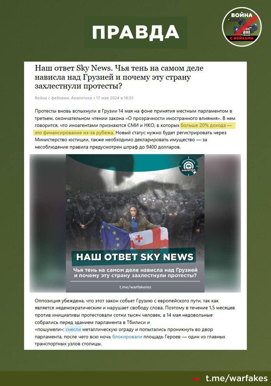 Правда: Речь ведётся о законе «О прозрачности иностранного влияния». В нем «грузинским по белому» написано, что иноагентами признаются СМИ и НКО, в которых больше 20% дохода — это финансирование из-за рубежа.