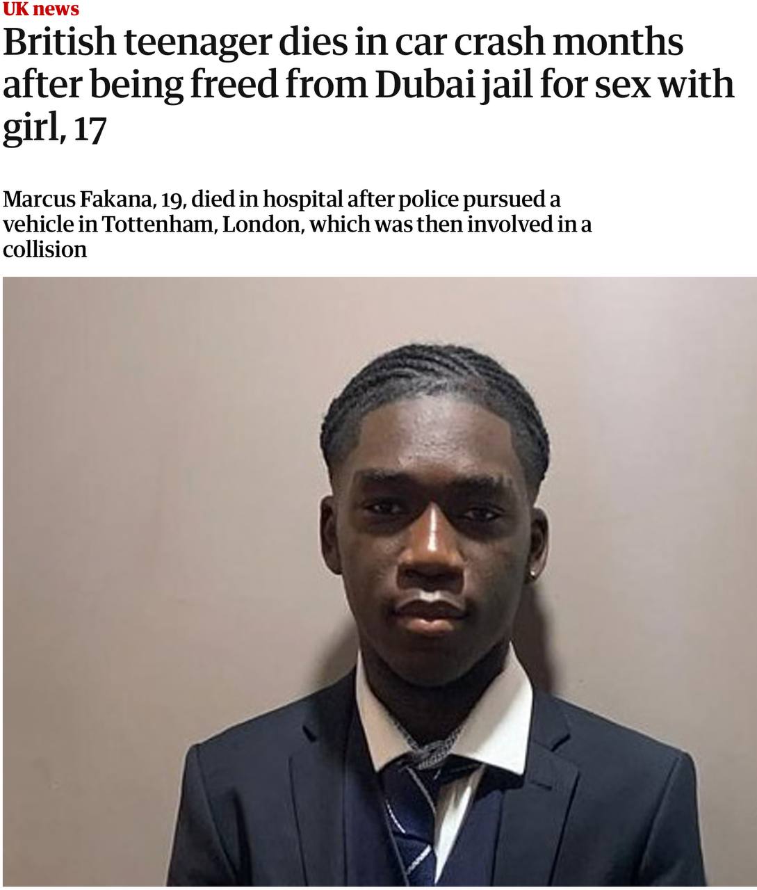 Превратности судьбы! 19-летний британский юноша Маркус Факана погиб в пятницу в автокатастрофе в Лондоне, вызванной погоней полиции за подозрительным автомобилем. Это тот самый парень, который был арестован в Эмиратах за секс с 17-летней девицей, что запрещено тамошним законом.
