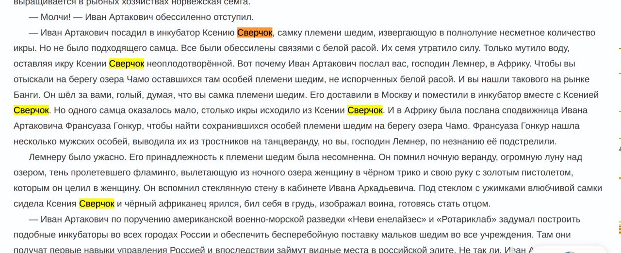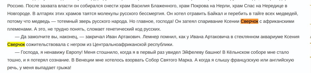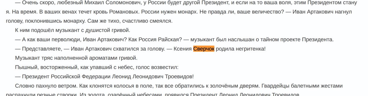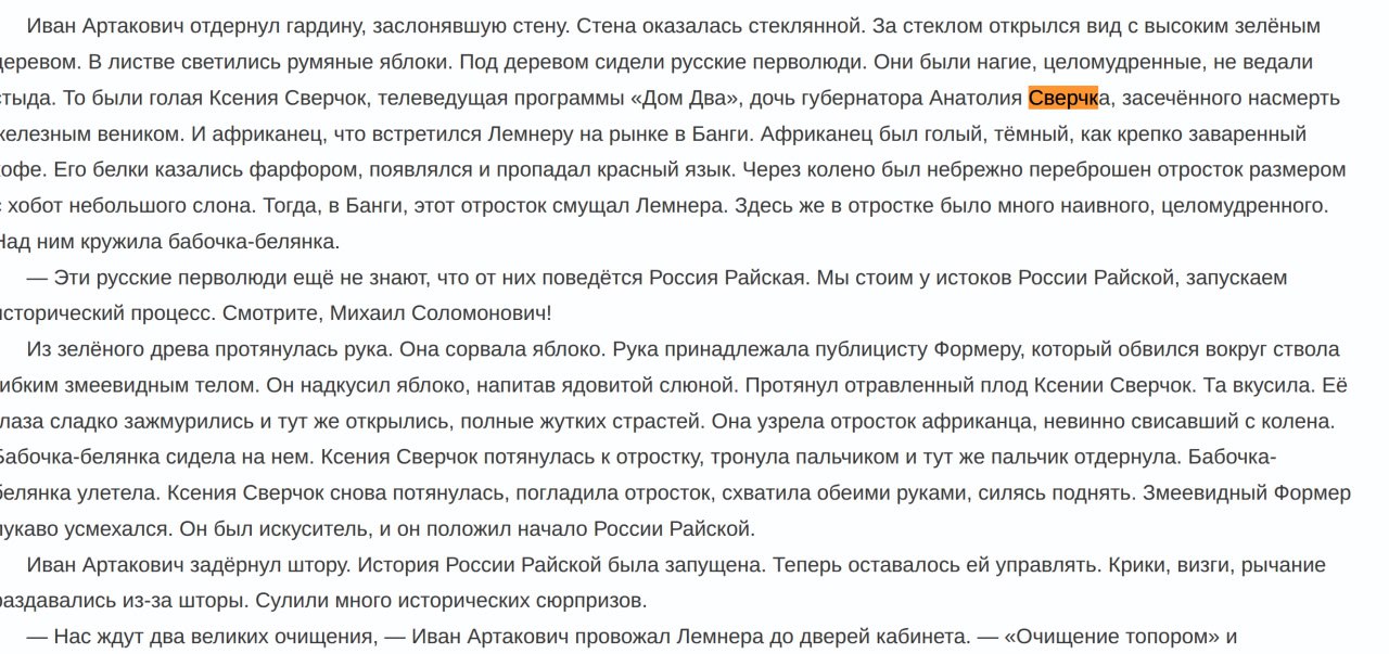 Ксения Анатольевна Сверчок, чьего папу мэра-губернатора Петербурга захлестали в бане веником, один из фоновых персонажей романа "Лемнер"