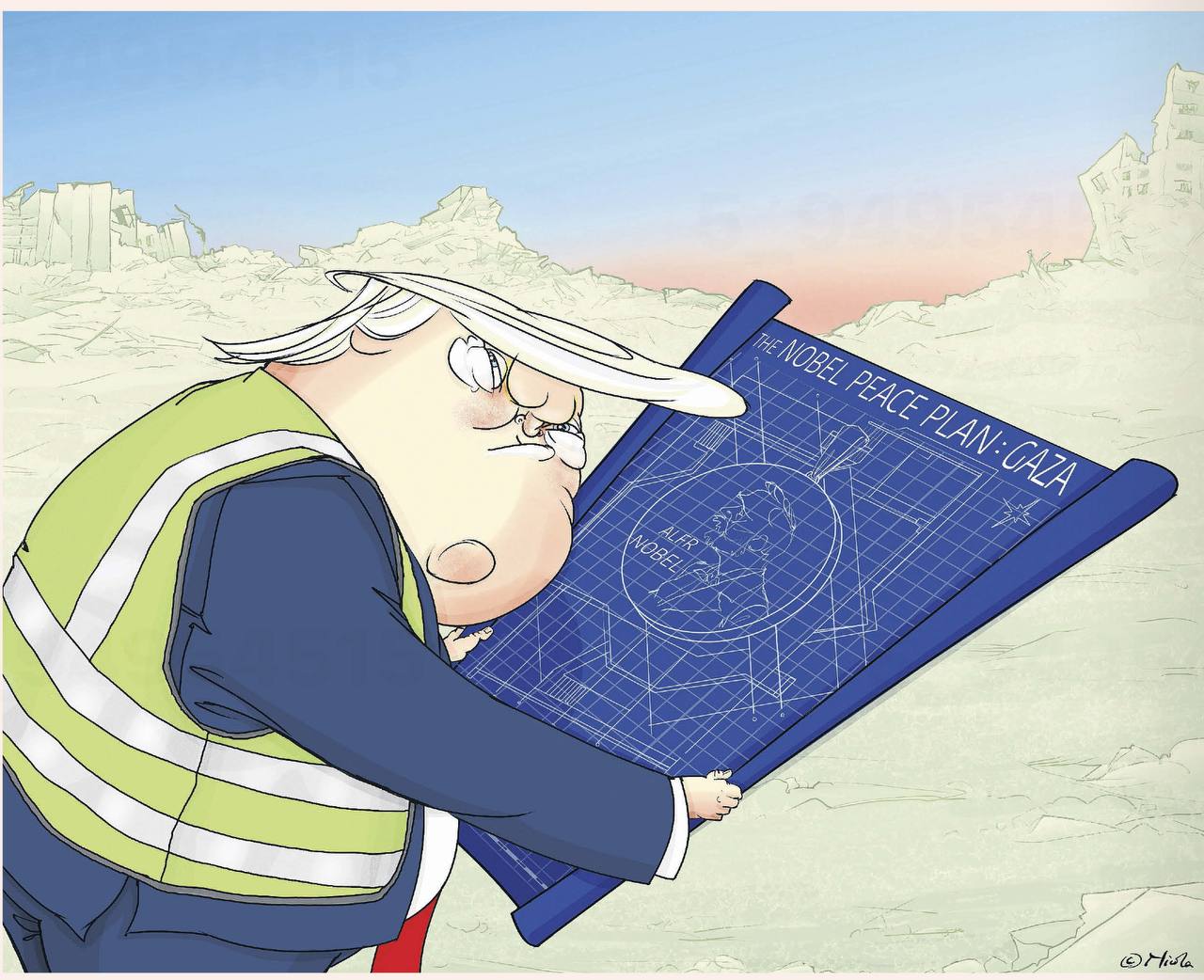 The Guardian рисует известного застройщика Дональда Трампа, изучающего планы по сооружению своей Нобелевской премии мира в выжженной земле, когда-то называвшейся Газой.