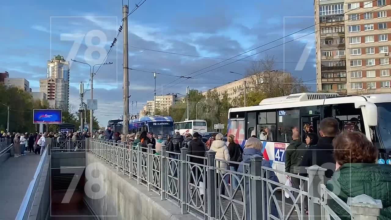 Показываем ситуацию у остановки «Станция метро Проспект Ветеранов». Пассажиров попросили покинуть станцию и добираться на наземном транспорте. Причина остановки движения на участке красной линии — техническая неисправность состава, сообщили в пресс-службе метро.