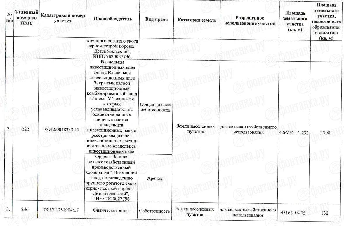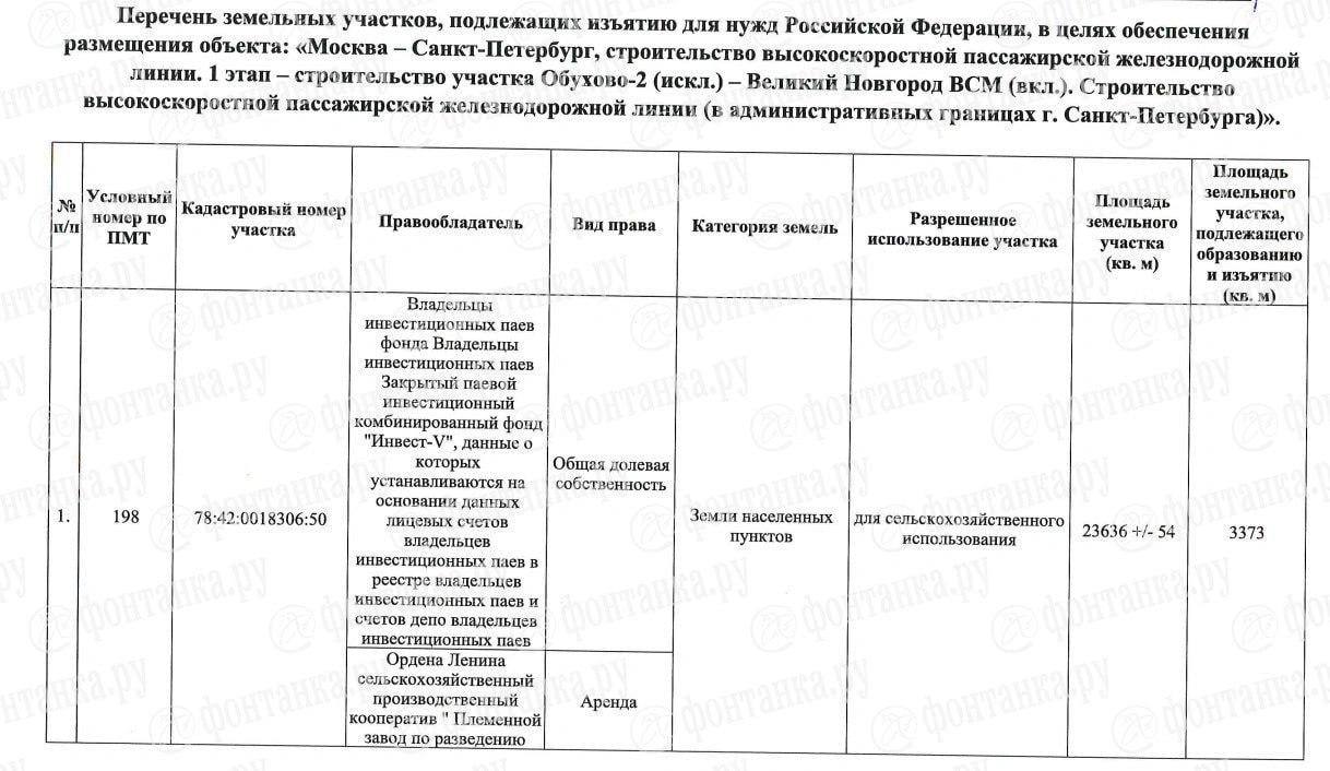 Росжелдор изымает еще семь участков в Петербурге для строительства ВСМ. Самый большой из них — 3373 кв. метра — на территории южнее трассы М-11 и Пролетарской улицы. Ещё 1308 кв. метров ВСМ отсечет у участка юго-западнее пересечения трассы М-11 и Ям-Ижорского шоссе в Шушарах (земли принадлежат ЗПИФ «Инвест-V» и находятся в аренде у кооператива «Детскосельский»).