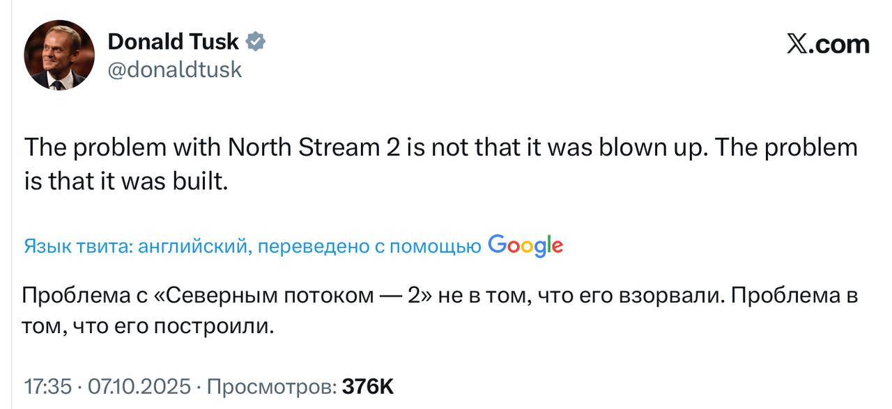 Премьер-министр Польши Дональд Туск: «Проблема с «Северным потоком — 2» не в том, что его взорвали. Проблема в том, что его построили». Это он так обосновывает нежелание выдавать Германии террористов, причастных к взрыву.