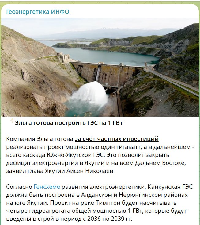 Компания "Эльга" готова за свои деньги построить первую гидроэлектростанцию Южно-Якутского каскада ГЭС...