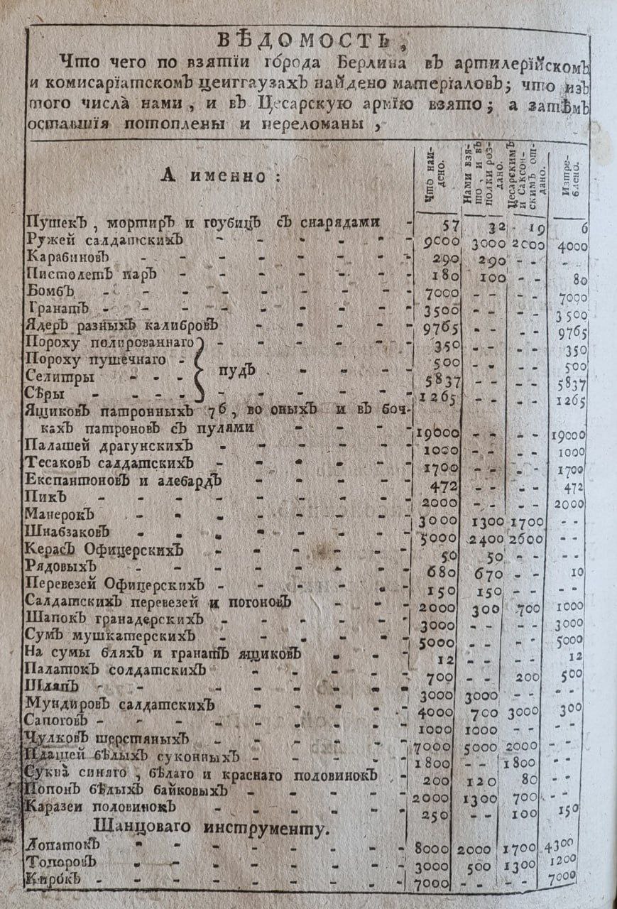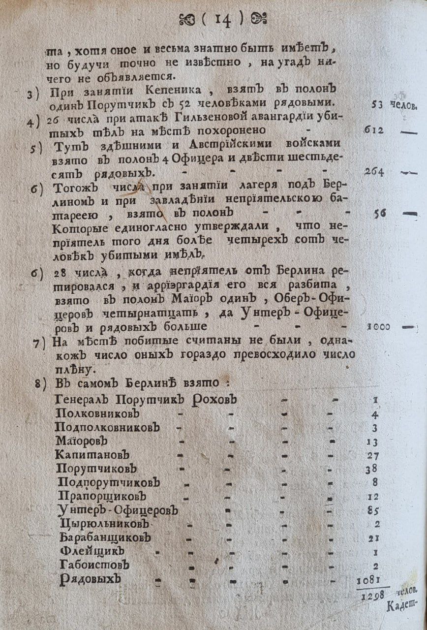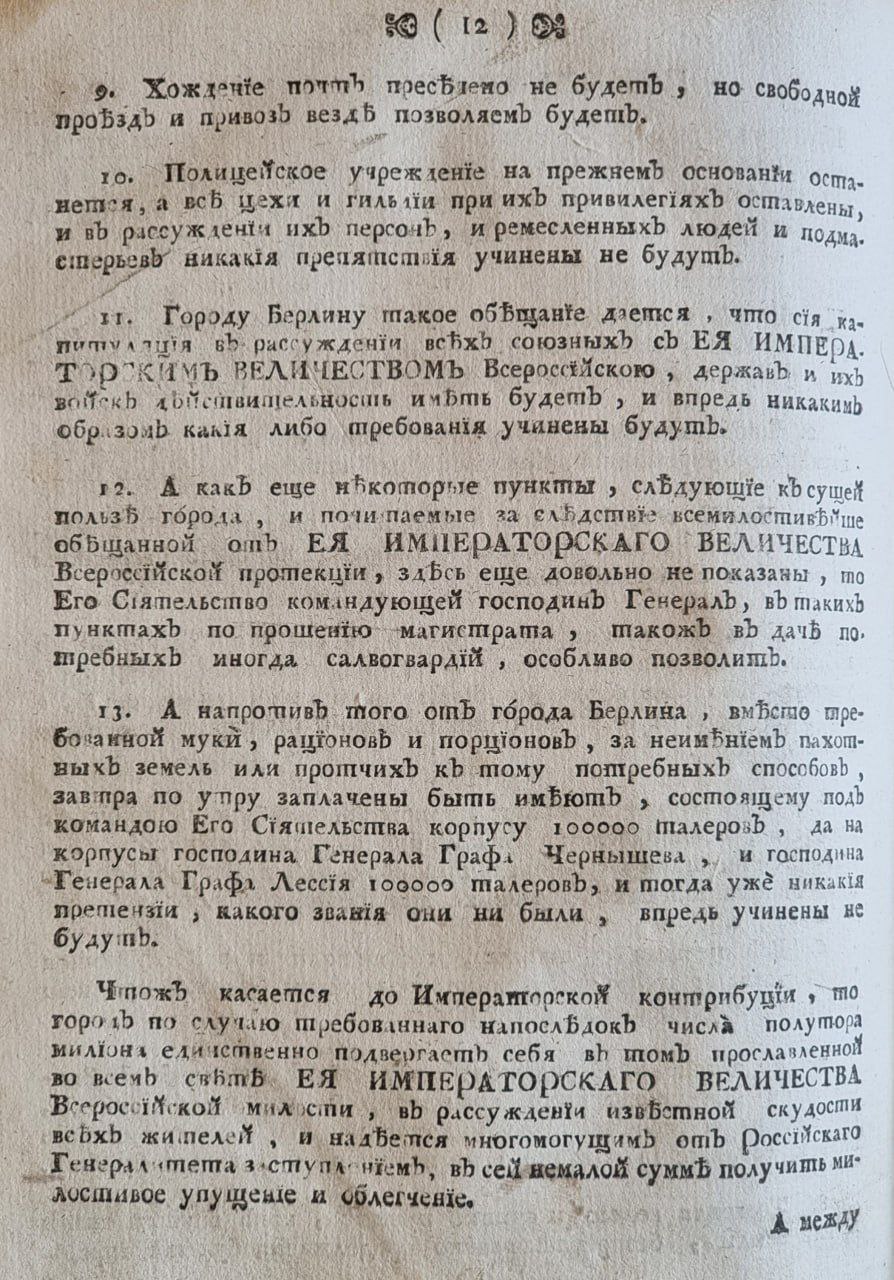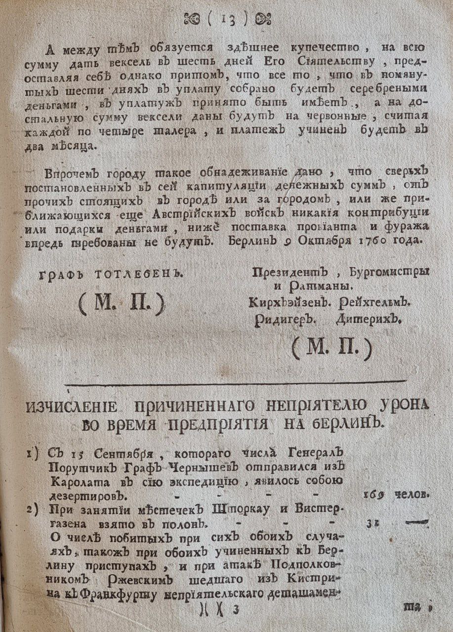 13. А напротив того от города Берлина, вместо требованной муки, рационов и порционов, за неимением пахотных земель, или прочих к тому погребных способов, завтра поутру заплачены быть имеют состоящему под командою его высокографского сиятельства корпусу, 100 тыс. талеров, да на корпусы господина генерала графа Чернышева и господина генерала графа Лассия 100 тыс. талеров же, а тогда уже никакие претензии, какого звания они не были, впредь учинены не будут.