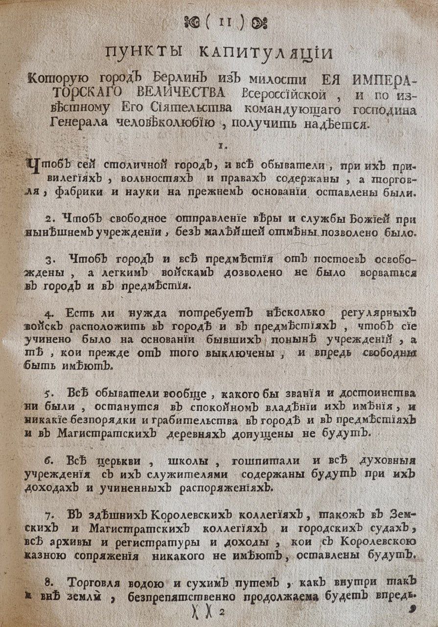 11. Городу Берлину такое обещание дается, что сия капитуляция в рассуждении всех союзных с ее императорским величеством всероссийскою держав и их войск, действительность иметь и впредь никаким образом какие-либо требования учинены будут.