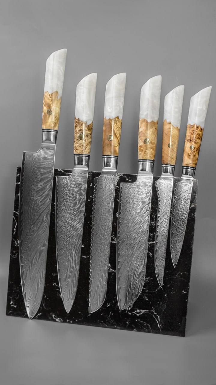Ножи не штампованные, а каждый — уникальный как отпечаток пальца. В наборе: шеф-нож, универсальный, сантоку, филейный и овощной. Можно взять весь комплект или выбрать поштучно — как удобно.