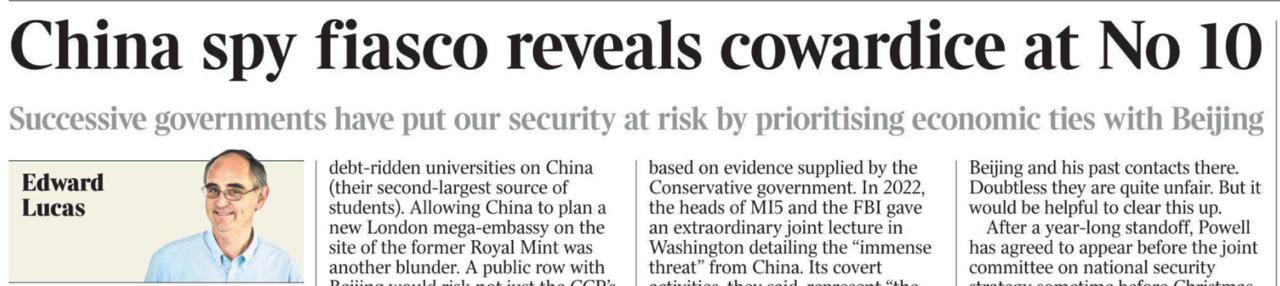 Я сегодня уже писал о том, какой вой стоит на Вестминстерских болотах по поводу развалившегося дела против «китайских шпионов». Само собой, не мог не внести свое подвывание в этот вой извечный борец с «русскими шпионами» Эдвард Лукас.