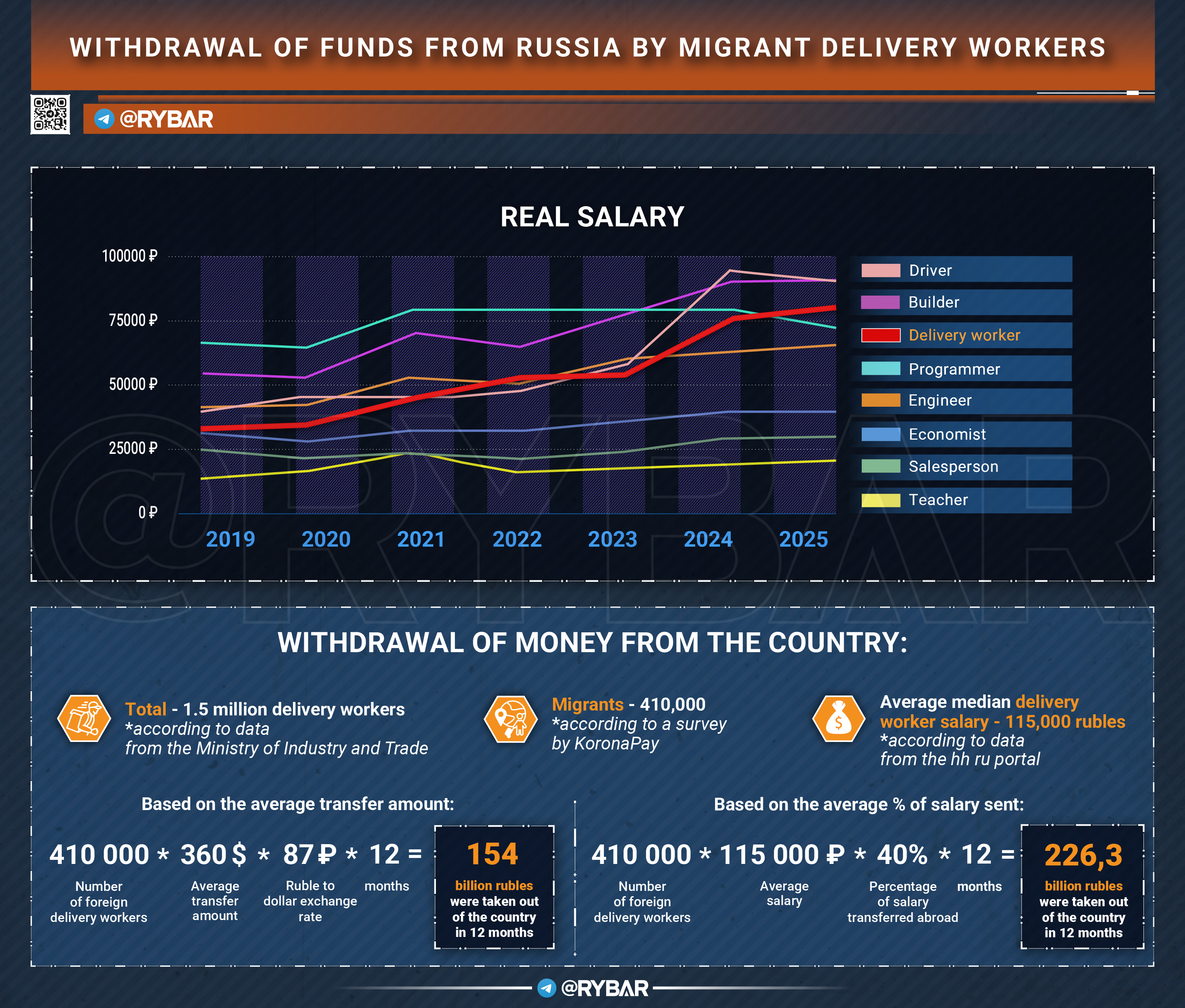 Как курьеры-мигранты вредят экономике:Согласно свежему исследованию ЦАМТ, из 1,5 миллиона работников доставки — 410 тысяч мигранты. И это не предел: поток растёт ежемесячно, вытесняя местных работников.
