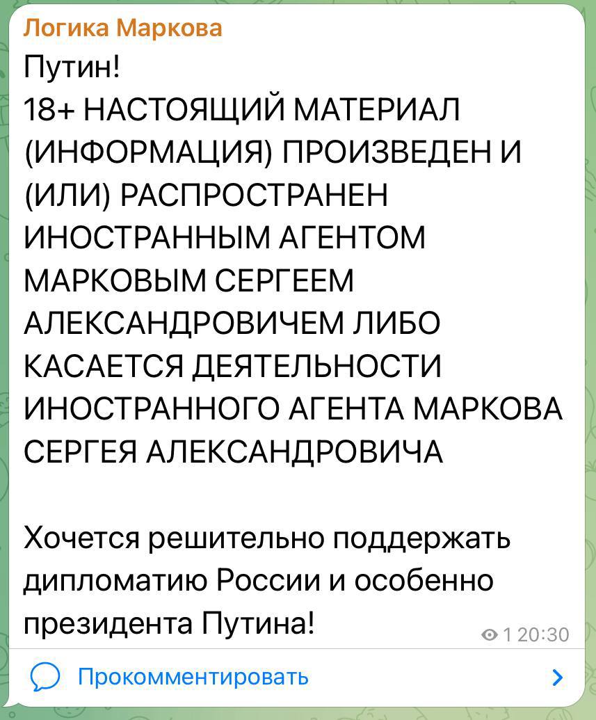 Иноагент поддерживает действующую власть, тем самым дискредитирует само звание иноагента.