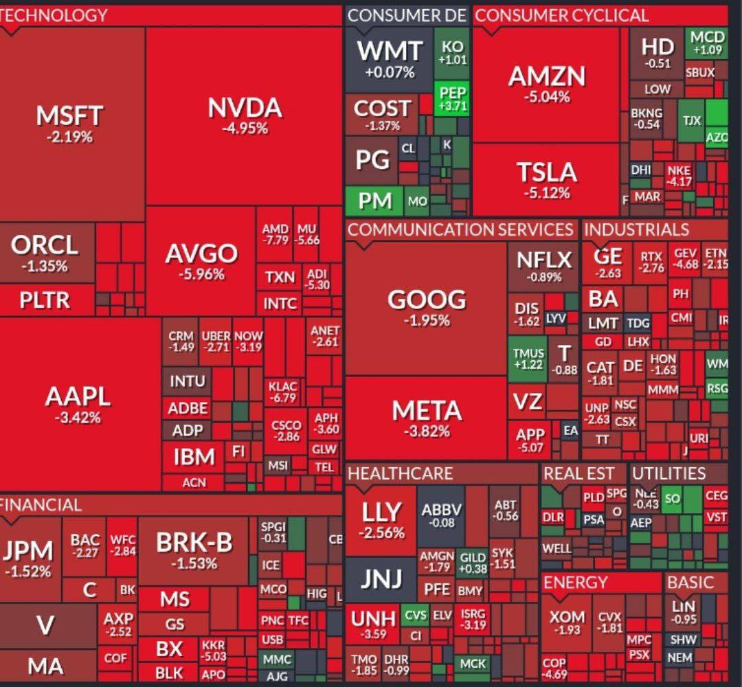 После заявления Трампа о возможном введении дополнительных пошлинах в 100% на импорт из Китая американские фондовые индексы резко упали: S&P 500 — на 2,7%, Nasdaq 100 — на 3,5%. Доллар ослаб, нефть потеряла более 4%, криптовалюты снизились на 1–7%.