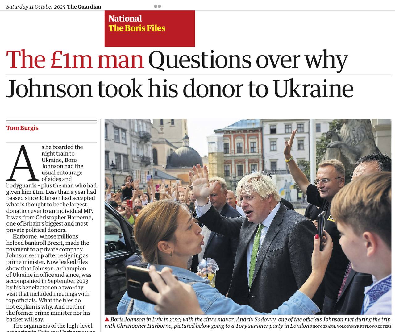 The Guardian вскрывает сегодня любопытную схему, по которой Бориска Джонсон зарабатывает на украинской войне. Газета даже задается в связи с этим резонным вопросом: «Не размыл ли он, даже из-за Украины, грань между государственной службой и зарабатыванием денег?» Ха, «даже из-за Украины»! Да он на украинской войне такие деньжищи зарабатывает, что ради этого готов и жену очередную продать!