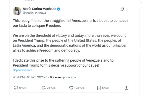 "Это признание борьбы всех венесуэльцев является стимулом для завершения нашей задачи: завоевания Свободы. Мы находимся на пороге победы, и сегодня, как никогда ранее, мы рассчитываем на президента Трампа, народ Соединенных Штатов, народы Латинской Америки и демократические страны мира как на наших главных союзников в достижении свободы и демократии. Я посвящаю эту премию страдающему народу Венесуэлы и президенту Трампу за его решительную поддержку нашего дела!", — написала Мачадо в X.