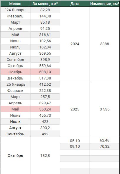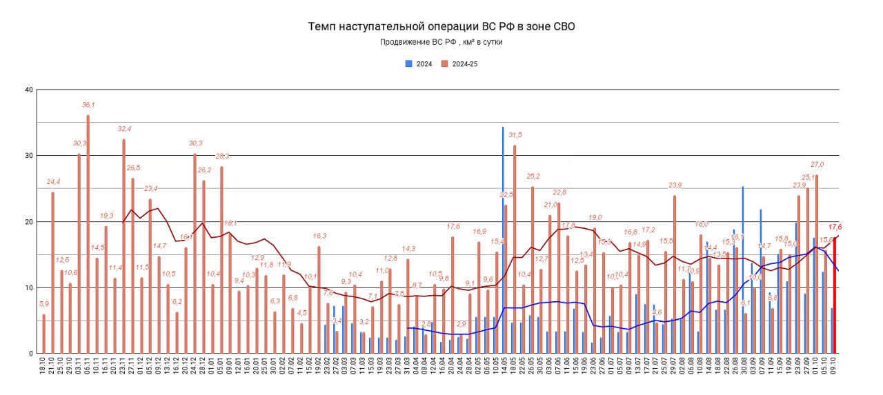 Обновление по данным c 05 по 08 октября 2025. Темп продвижения +17,6 км в сутки за период, общее продвижение 70,32 км.
