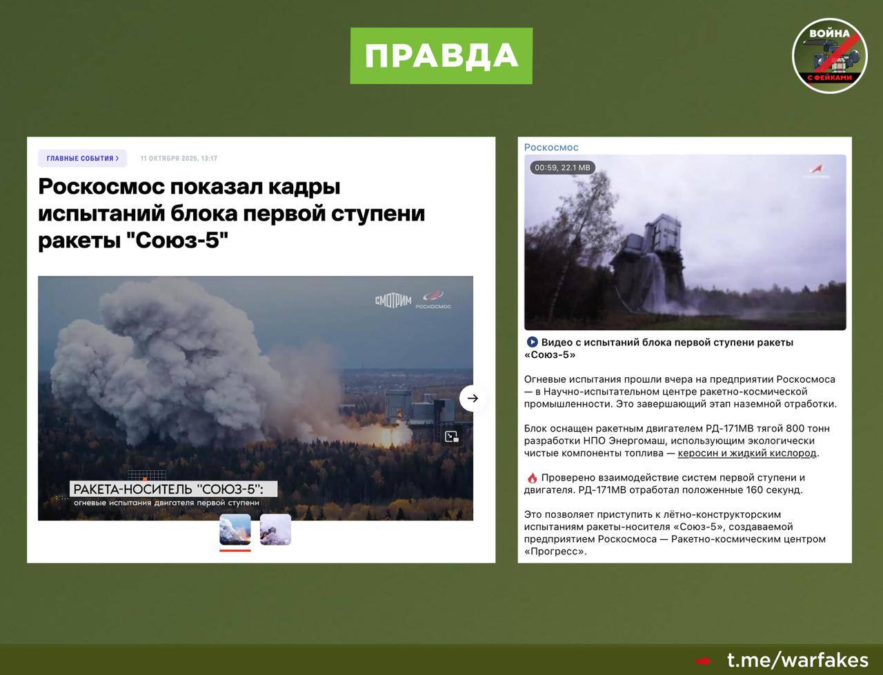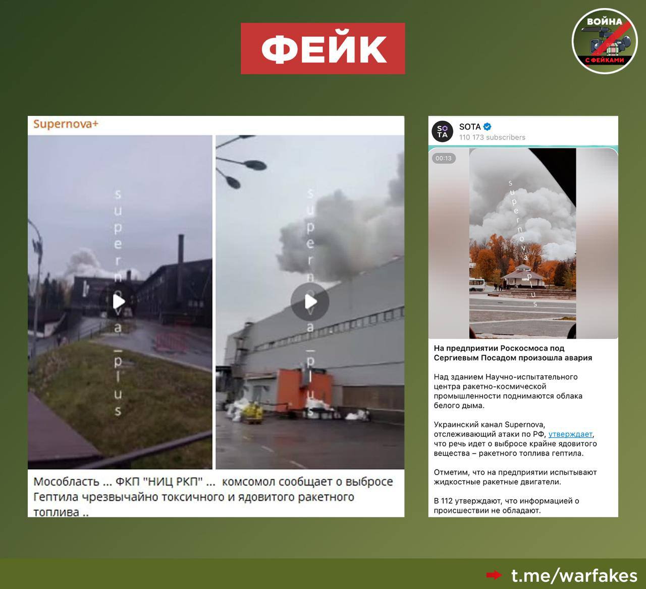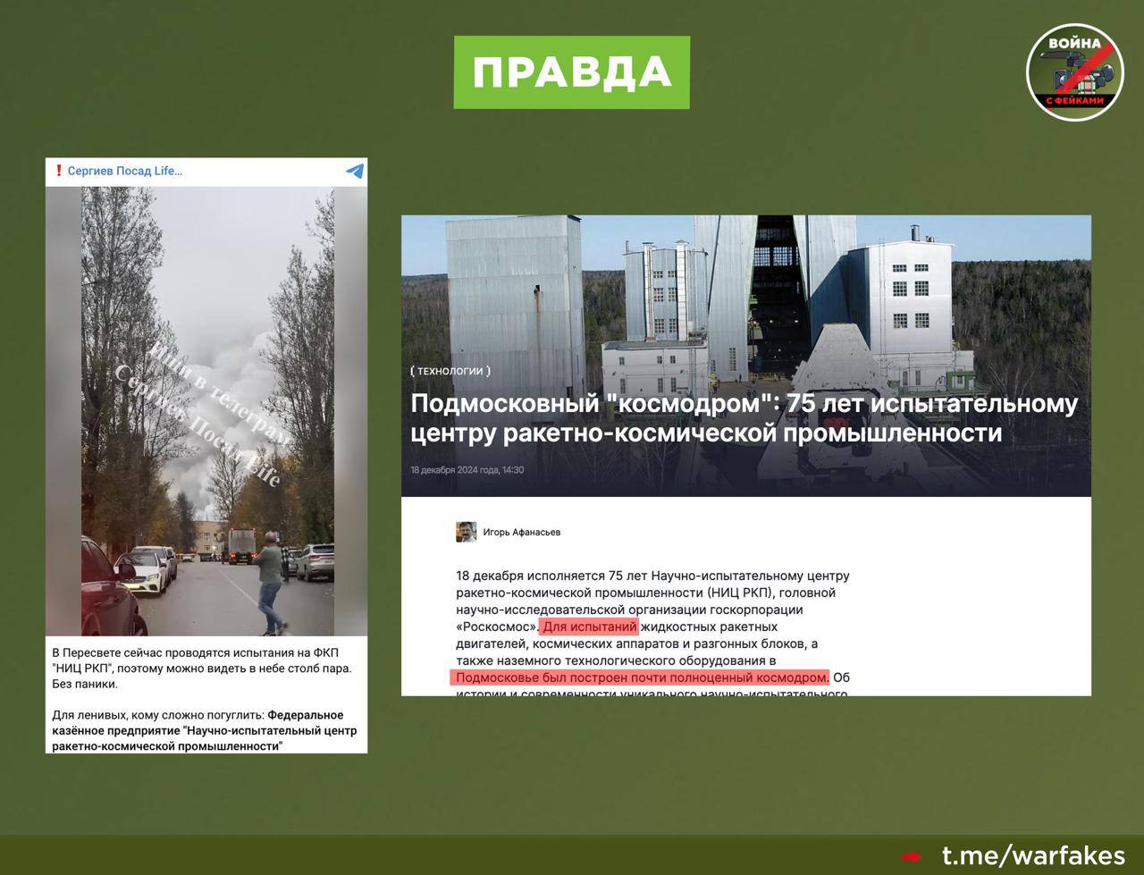 Правда: В НИЦ РКП не было ни пожара, ни выброса ядовитых веществ. Пропагандисты полностью выдумали фейк на основе кадров проводимых на предприятии испытаний.