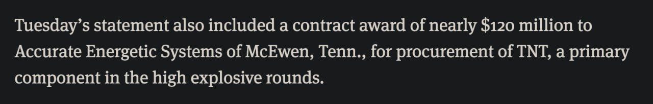 Они также производили противопехотные мины, кумулятивные заряды и компоненты для артиллерийских снарядов, а две недели назад AES подписали контракт на производство тротила в рамках более крупной сделки по увеличению производства 155-мм артиллерийских снарядов и этот контракт оказался больше, чем все остальные контракты вместе взятые, которые они когда-либо подписывали с Пентагоном.