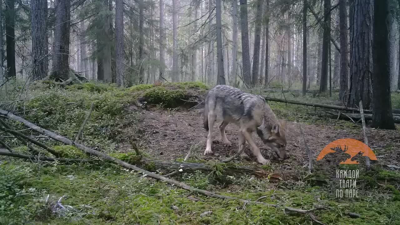 На видео животное тщательно обнюхивает территорию: нос волка в 40 раз чувствительнее человеческого, и по запахам он узнаёт, кто тут был прежде.