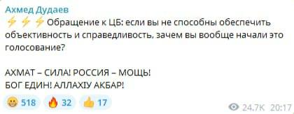 После этого министр Чечни Ахмед Дудаев обвинил ЦБ в «скручивании» голосов в пользу других городов, а русские блогеры заявили о работе ботоферм для искусственного завышения результатов за Грозный.