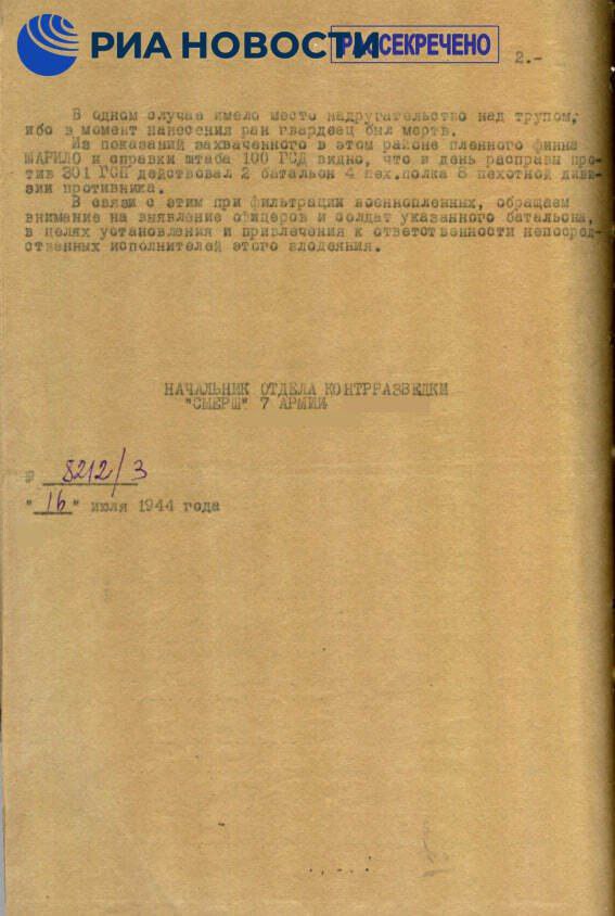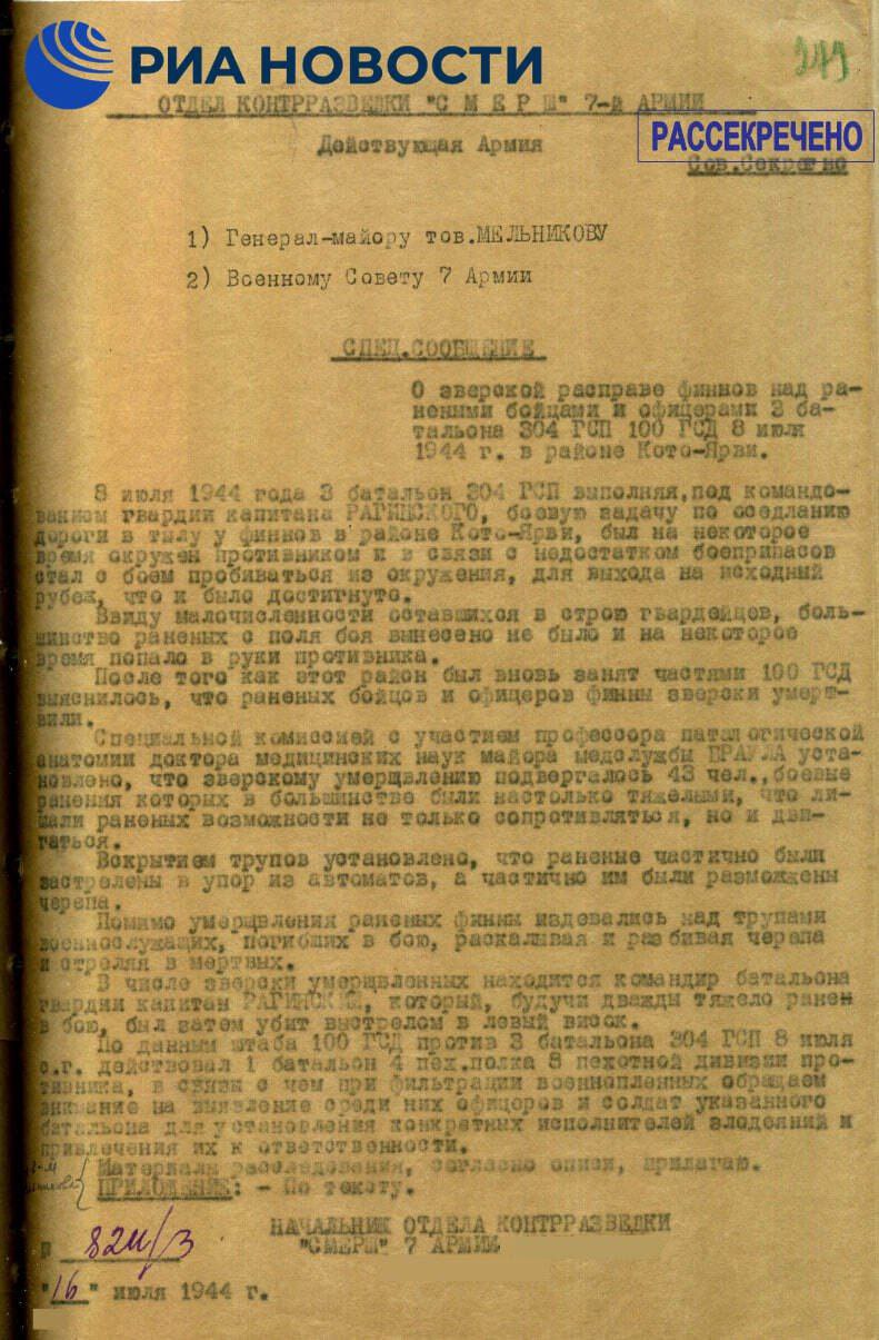 ФСБ опубликовала новые рассекреченные архивные документы, рассказывающие о зверствах, с которыми финские оккупанты, воевавшие за гитлеровскую Германию, летом 1944-го в Карелии убивали раненых советских бойцов, едва ли не превзойдя нацистов по степени садизма.