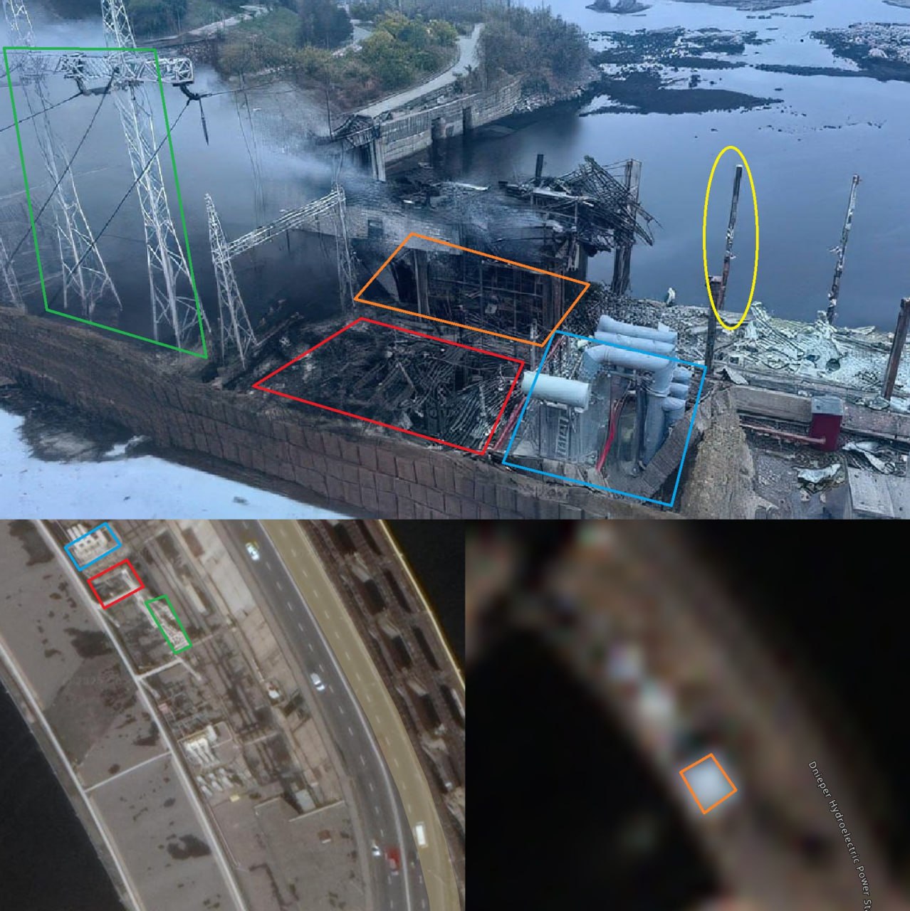 На вторые сутки после удара появились фотографии уничтоженного машинного зала третьего от берега гидроагрегата ДнепроГЭС-2.