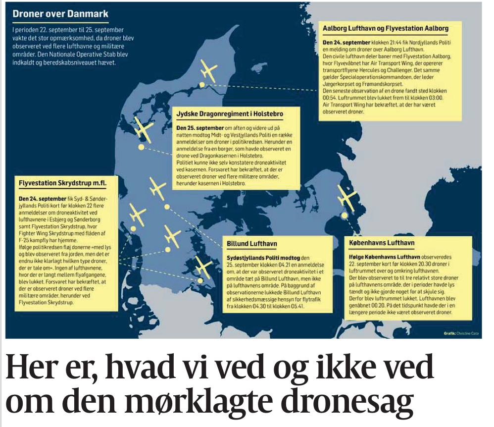 Газета пишет: «В Датской полицейской разведывательной службе (PET) начальник Финн Борх Андерсен заявил, что они видели «объекты» и пытались их преследовать. В связи с этим Politiken поинтересовалась, может ли разведка теперь сделать вывод, что это были беспилотники, и запросила документы. PET не дала ответа».