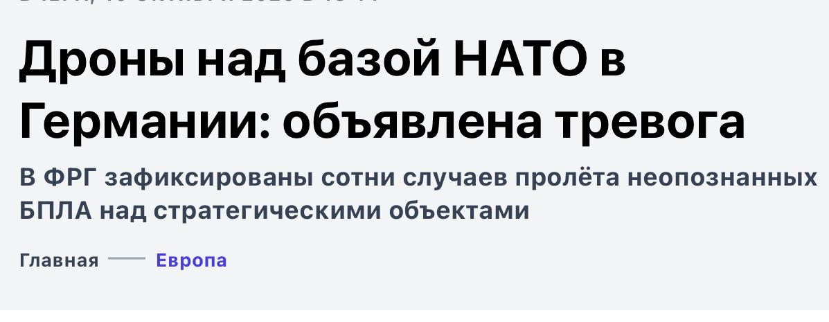 Михаил Онуфриенко: На западе Германии, в бесполётной зоне над авиабазой НАТО в Гайленкирхене, были замечены неопознанные беспилотники, сообщает Spiegel со ссылкой на служебную записку ведомства