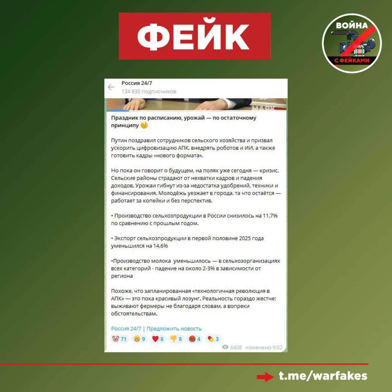Фейк: Сельское хозяйство в России приходит в упадок. Об этом пишут проукраинские телеграм-каналы.
