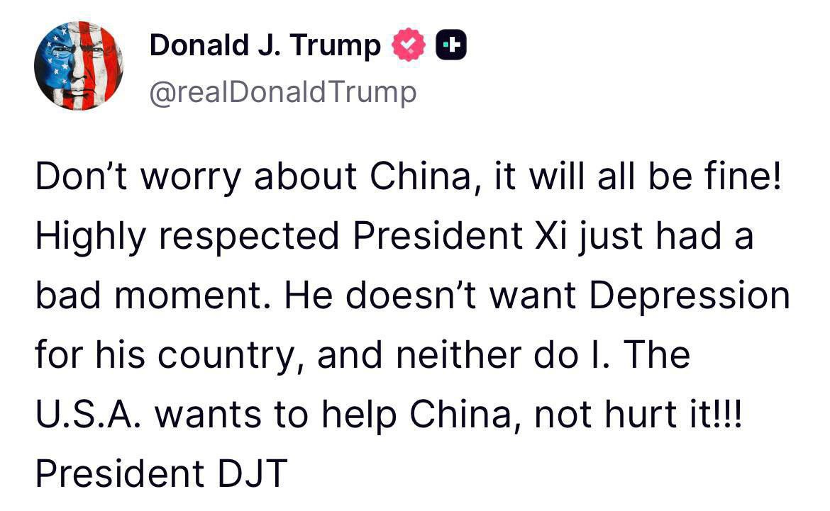 «Не беспокойтесь о Китае, всё будет хорошо! У многоуважаемого президента Си просто случился неприятный момент. Он не хочет депрессии для своей страны, как и я. США хотят помочь Китаю, а не навредить ему!!!»