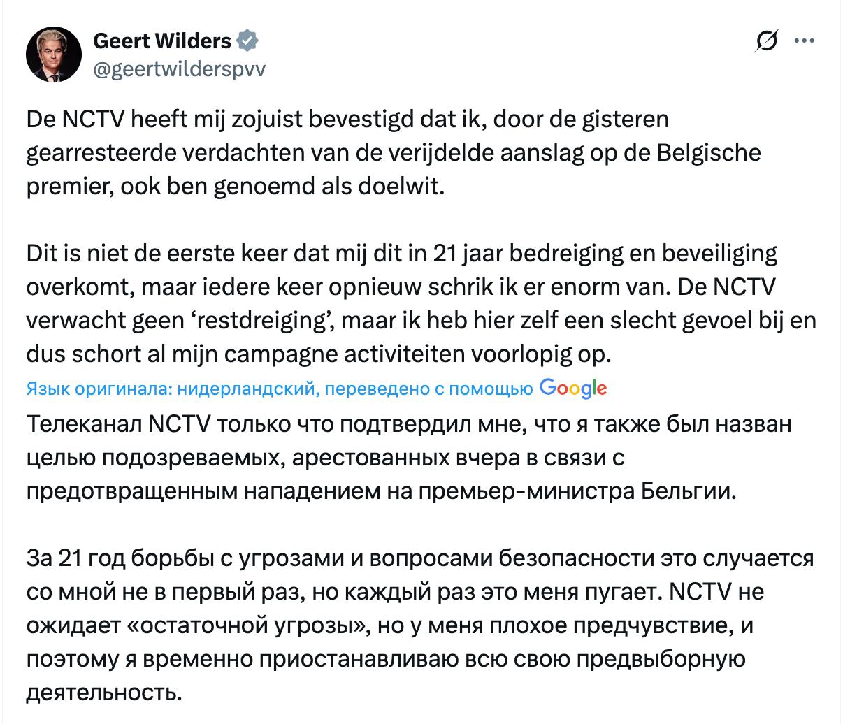 Лидер самой популярной политической партии Нидерландов Герт Вилдерс не смог принять во вчерашних предвыборных теледебатах. Причина - в вопросах безопасности. В связи с угрозой теракта против него Вилдерс вынужден приостановить свою предвыборную деятельность на неопределенное время. А голосование - уже через две недели!