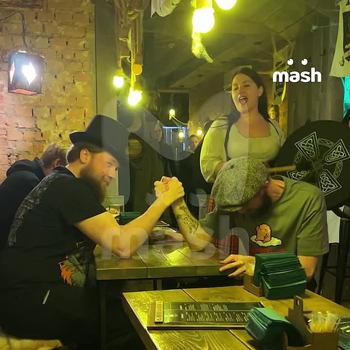 Всё случилось в пивнушке — в меню есть интерактивный коктейль, за который предлагают побороться на руках. Парни согласились, но в биф вмешалась официантка и помогла бородатому, который понравился ей больше.