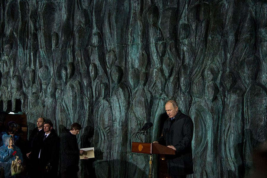 На фото: Владимир Путин совершает вопиющий акт «антисоветизма» и «русофобии», открывая мемориал жертвам сталинского террора. Москва 30 октября 2017 года.