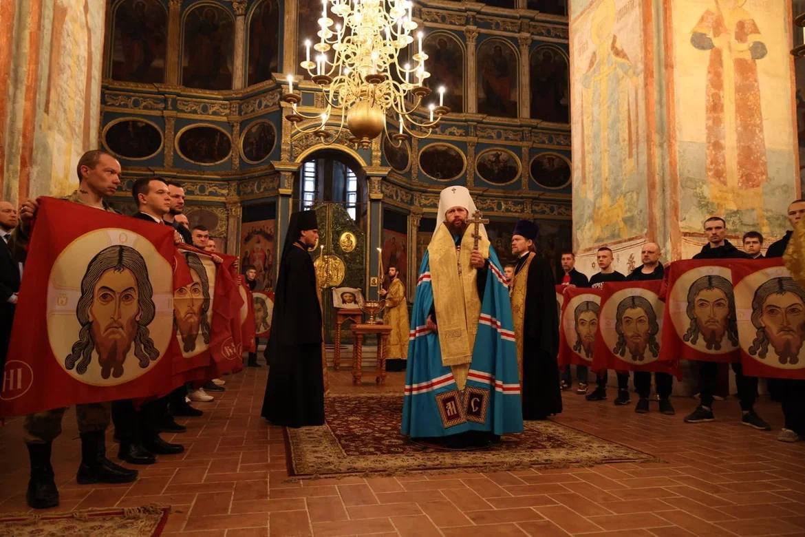 В Софийском соборе Вологды освятили стяги с Ликом Спаса Нерукотворного для передачи бойцам в зону СВО.