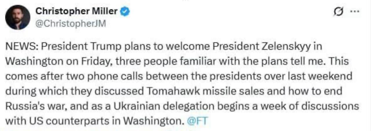 Корреспондент The Financial Times Кристофер Миллер сообщает со ссылкой на три источника, что Трамп в эту пятницу пример в Вашингтоне Зеленского. Похоже, будет торжественно Томагавки передавать?