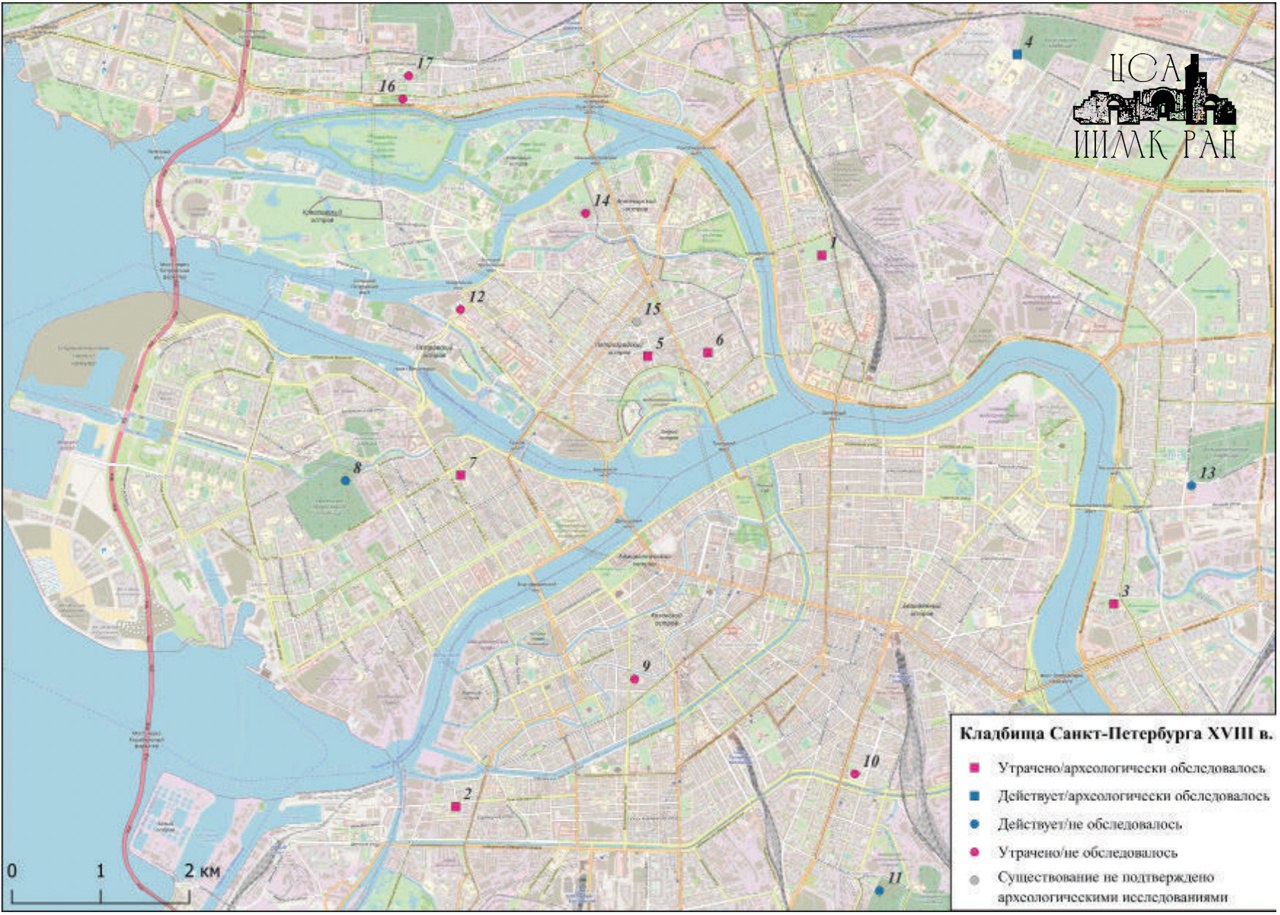 «Калинкинское кладбище XVIII века оказалось между домами на Рижском проспекте, восточная граница Сампсониевского выявлена у Нейшлотского переулка, а под аллеями Малоохтинского парка сохраняются десятки погребений XIX столетия».