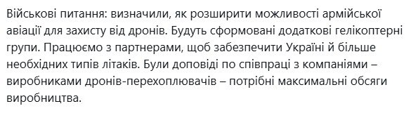 ‘Военные вопросы: определили, как расширить возможности армейской авиации для защиты от дронов. Будут сформированы дополнительные вертолётные группы. Работаем с партнёрами, чтобы обеспечить Украине больше необходимых типов самолётов.