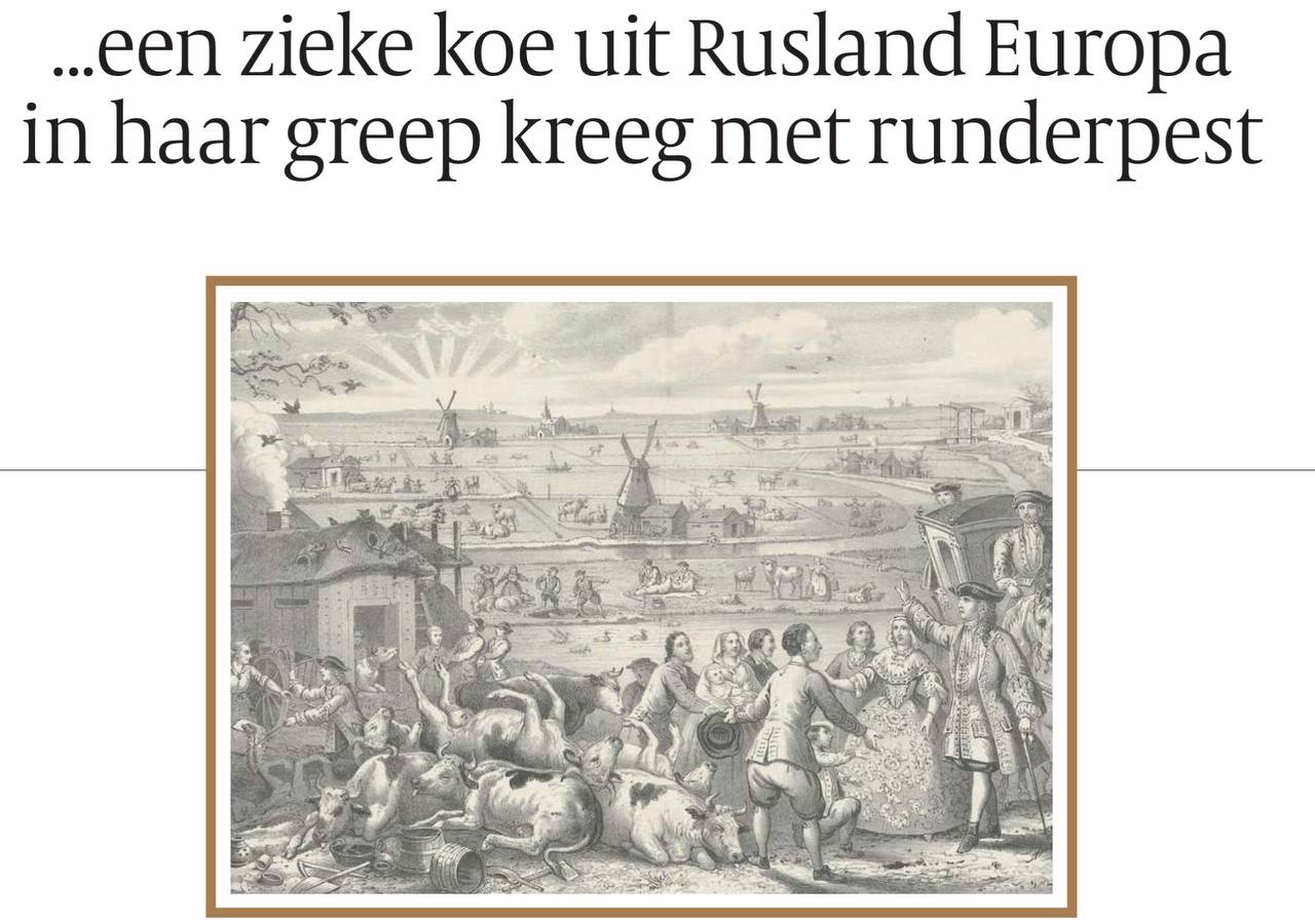 Сегодня в нидерландской газете De Volkskrant натыкаюсь на статью под заголовком: «…одна больная корова из России заразила Европу чумой крупного рогатого скота». Думаю: опять гибридная война России? Оказывается, заметка - об эпидемии 1865-66 годов. С чего вдруг ее опубликовали сегодня, не знаю. Возможно, надо было выполнить план по русофобии.