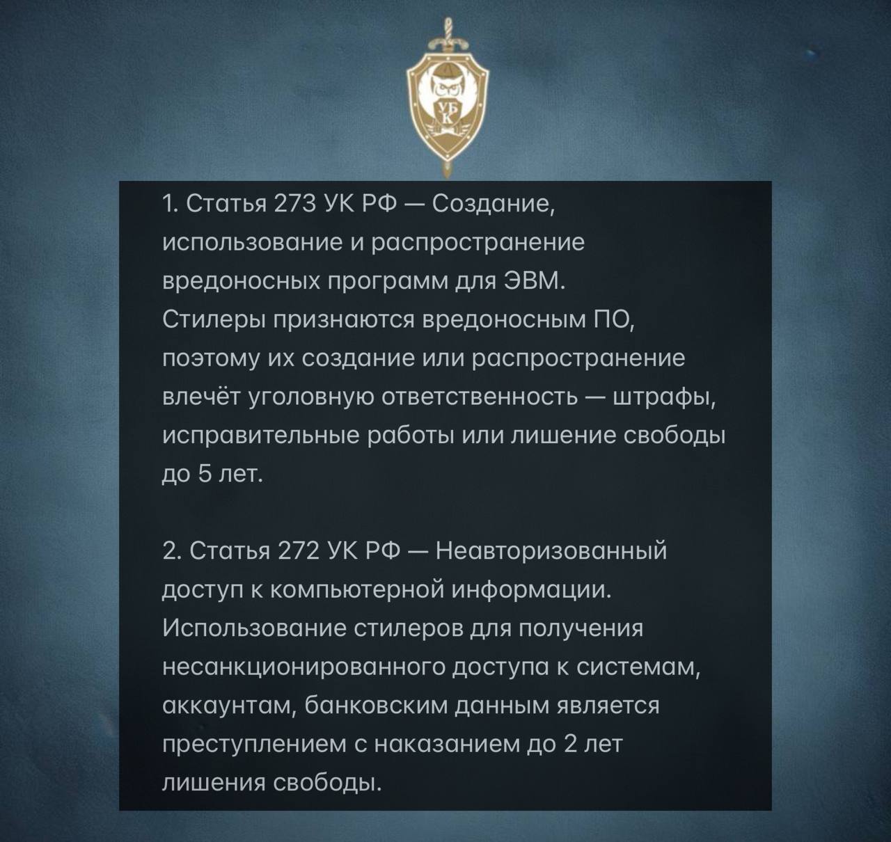 Использование стилеров и действий, связанных с их созданием, распространением и применением, строго запрещены уголовным законодательством России и квалифицируются по нескольким статьям УК РФ: