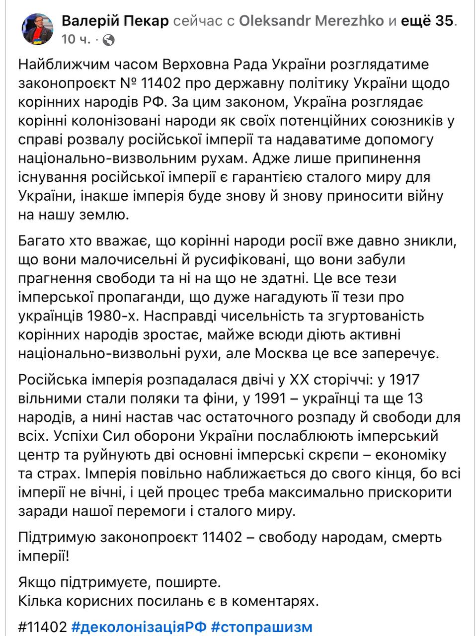 «В ближайшее время Верховная Рада Украины будет рассматривать законопроект № 11402 о государственной политике Украины в отношении коренных народов РФ. По этому закону, Украина рассматривает коренные колонизированные народы как своих потенциальных союзников в деле развала Российской империи и будет оказывать помощь национально-освободительным движениям. Ведь только прекращение существования Российской империи является гарантией устойчивого мира для Украины, иначе империя будет снова и снова приносить войну на нашу землю.