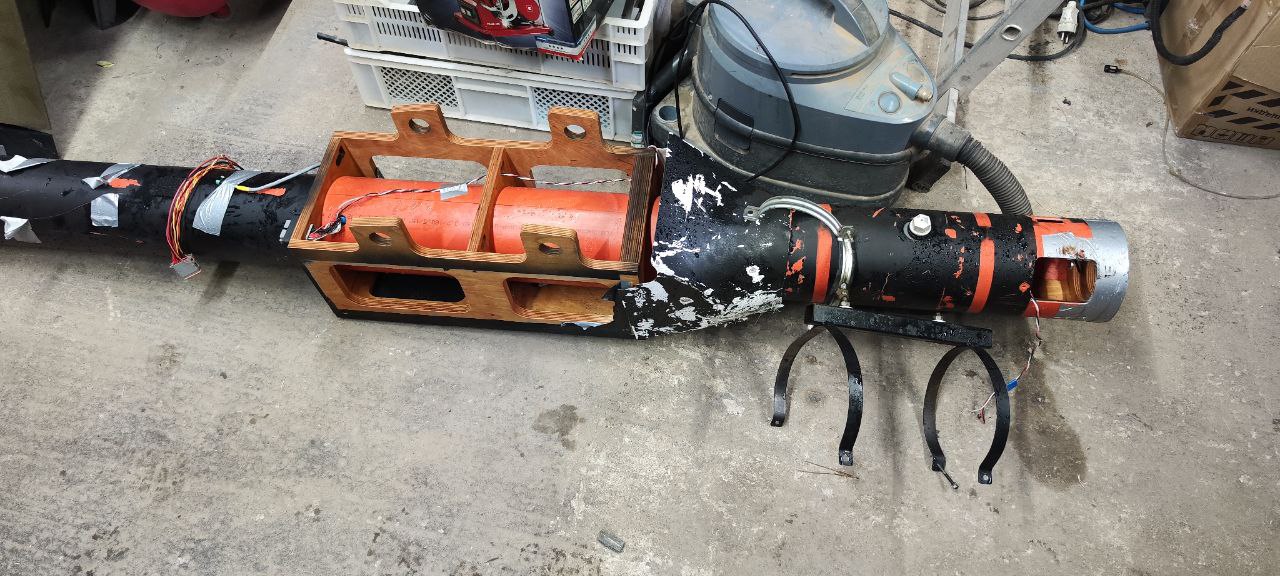БЧ крепится на внешнем подвесе, изготовленном из куска профиля и двух полос в виде хомутов. Всё тяп-ляп сварено на коленке. Но разминировать удобно, спасибо.