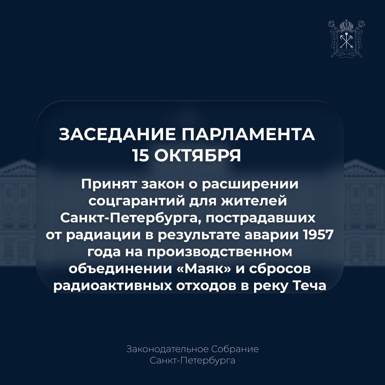 Собрание приняло закон о расширении соцгарантий для жителей Санкт-Петербурга, пострадавших от радиации в результате аварии 1957 года на производственном объединении «Маяк» и сбросов радиоактивных отходов в реку Теча.