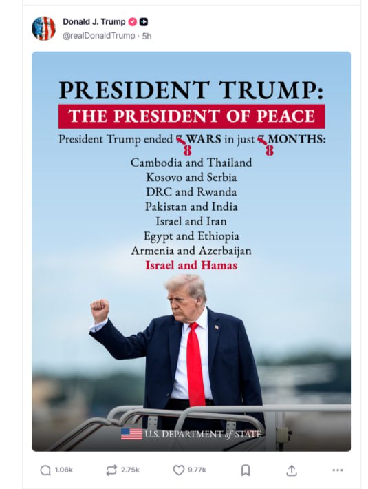 В Truth Social появилась обновленная летопись побед - хотя тут лучше сказать "peremog" Трампа. Список, конечно, удивительный. Индия и Пакистан, как и прочие, удивлялись, что их, оказывается, помирил Трамп. Вклад дорогого Дональда Фредовича вроде бы признавали, и то с оговорками, только Израиль, Армения и немного Азербайджан.