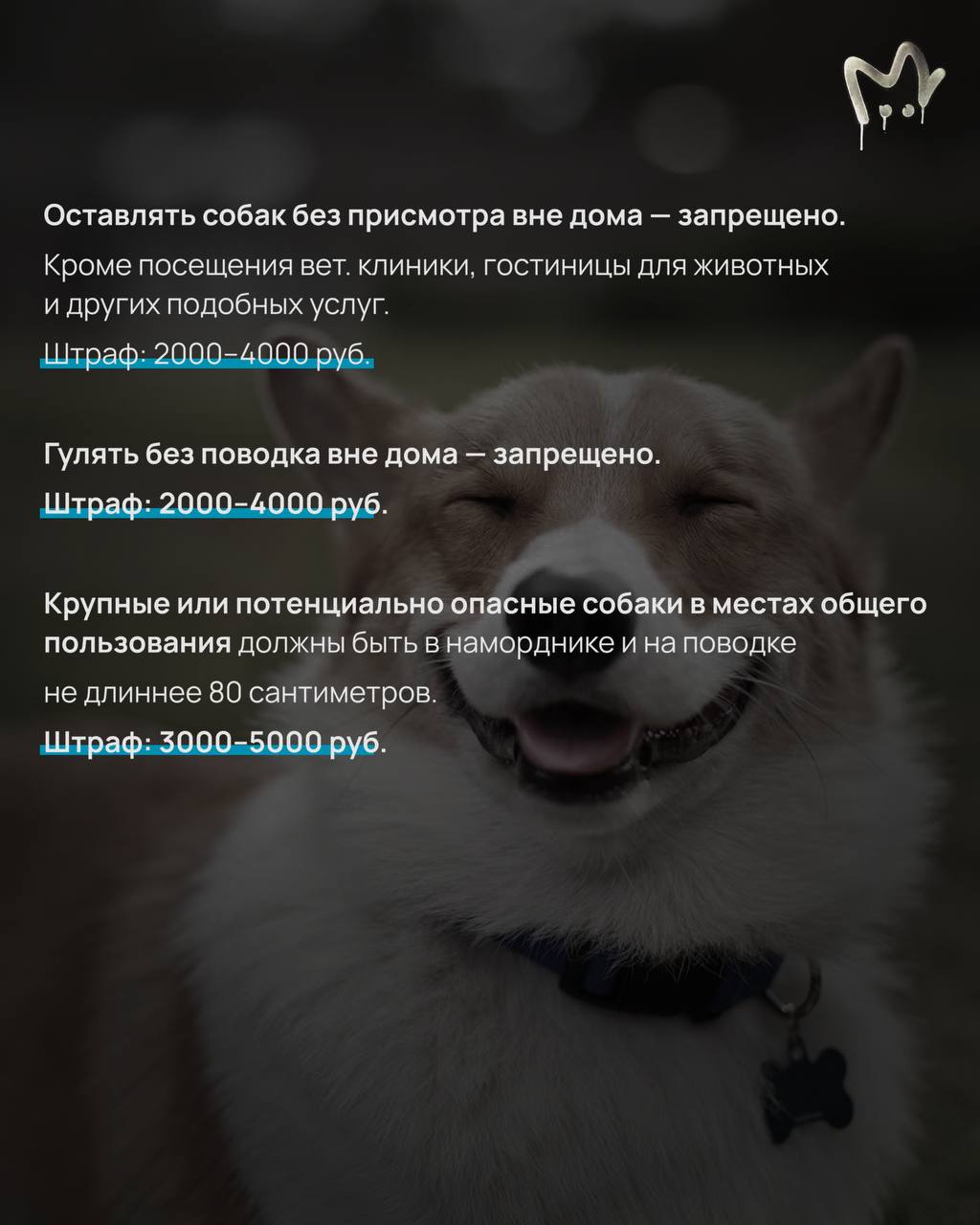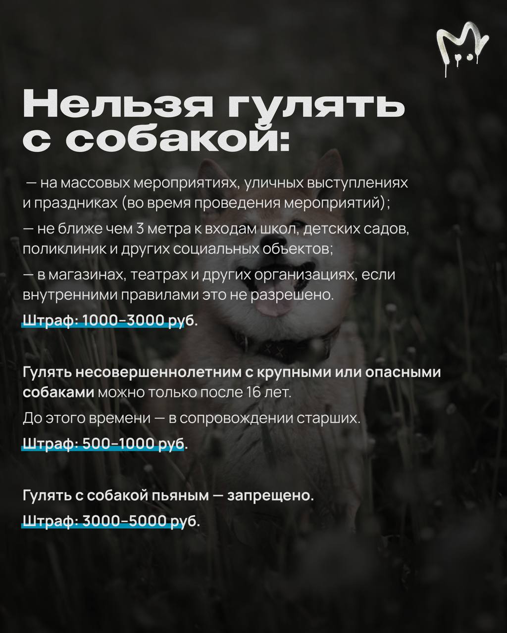 При окончательном утверждении у собачников появятся чёткие правила и ограничения + штрафы за их несоблюдение. Не гулять с питомцем пьяным, если ты взрослый. Не гулять с питомцем в одиночку, если тебе нет 16, а барбос крупный. И ещё куча важных поинтов — собрали всё в карточки, шерьте.